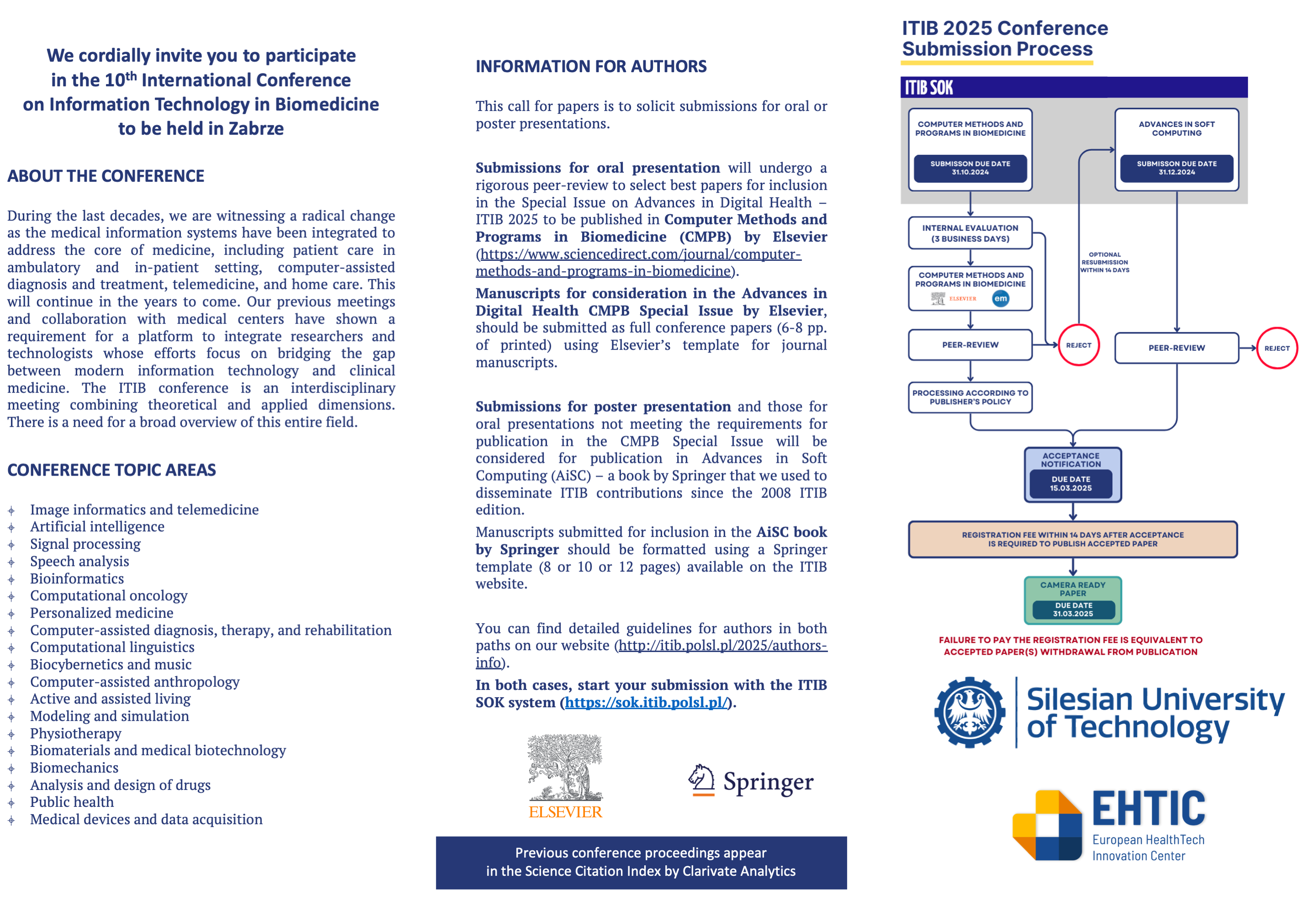 Contributors from research centers and industries are welcome to present their original results at scientific sessions, posters, exhibits, and unofficial meetings. The call for papers is to solicit submissions for the oral and poster sessions which are designed to be highly interactive. You are invited to share your research achievements with the international community by submitting a paper by November 30, 2024 October 31, 2024, to the Computer Methods and Programs in Biomedicine journal (IF'23=4.9) or by January 31, 2025 December 31, 2024, to the Springer series Advances in Intelligent Systems and Computing.